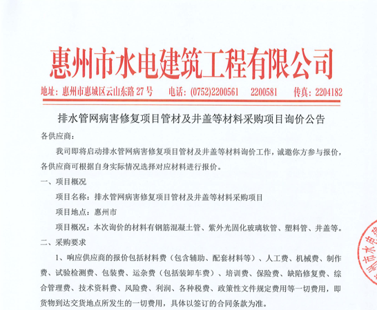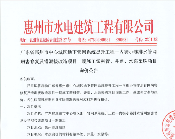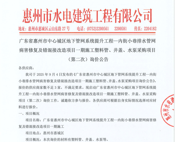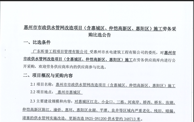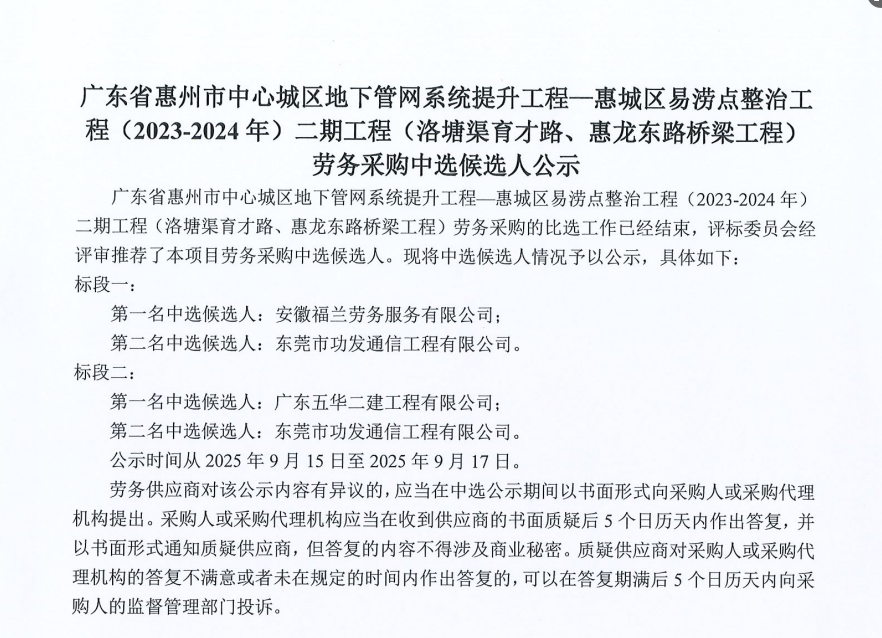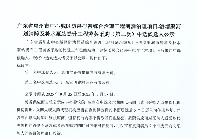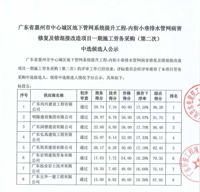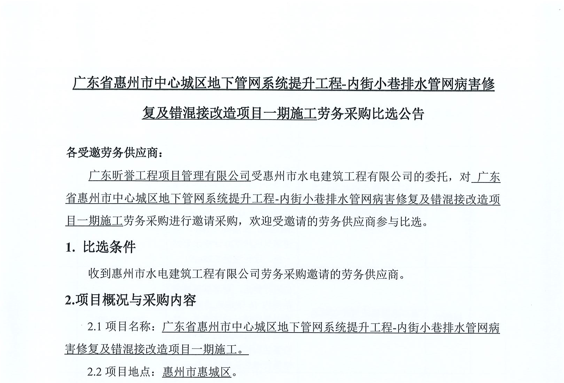 廣東省惠州市中心城區(qū)地下管網(wǎng)系統(tǒng)提升工程-內(nèi)街小巷排水管網(wǎng)病害修復(fù)及錯混接改造項(xiàng)目一期施工勞務(wù)采購(第二次)中選候選人公示……